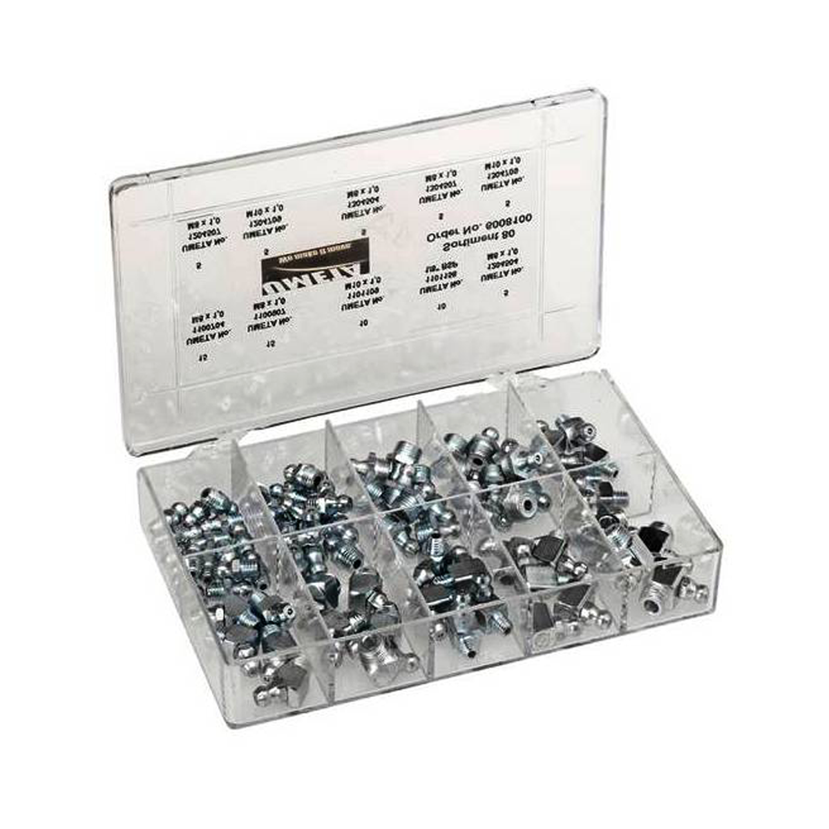 Smørenippel sortiment i plastboks. Indeholder 80 stk. galvaniseret smørenipler af typerne H1/H2/H3 i div. størrelser M6/M8/M10 samt 1/8" RG i tysk topkvalitet fra UMETA..